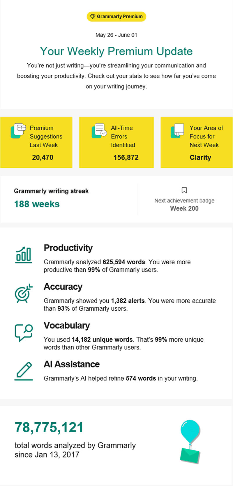I’ve also been relying on Grammarly to save on efforts to clean up my grammatical sloppiness and have been receiving weekly reports of my performance. Since January 13th of 2017, Grammarly reports processing almost 80 million words I’ve written. I’m also less than 3 months away from a 200-week writing streak achievement badge. (woohoo)