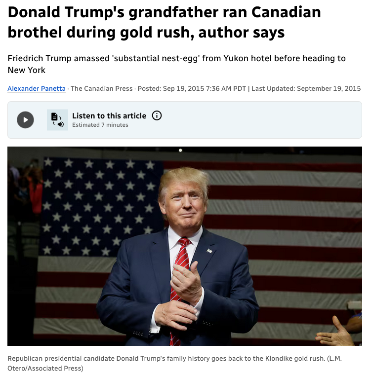Friedrich’s fortunes, however, came from his brothel operations. “Friedrich Trump amassed a ‘substantial nest-egg’ from the Yukon hotel before heading to New York.”