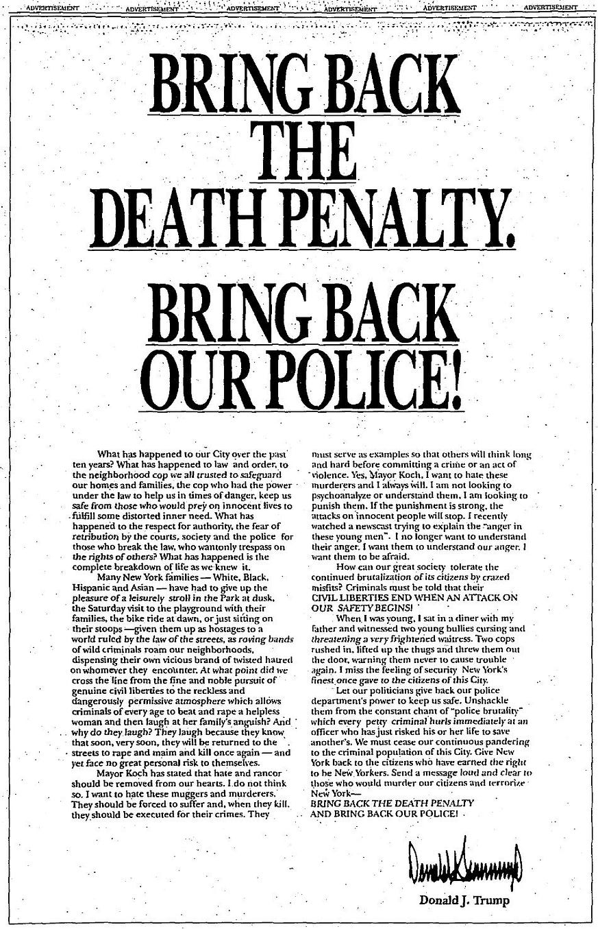 Fred Trump’s racism was an obvious influence on Donald, which explains his actions when posting a full-page editorial in the New York Times endorsing the death penalty for five innocent black men who were eventually exonerated of the rape charges levelled against them.