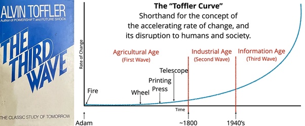 Technological change alone represents multiple dramatic transformations of human society and in how we will live from day to day. Today’s world of work will appear both alien and punitive to a world of work that will more closely resemble pre-industrial human society, according to Toffler’s third future-prediction book, “Third Wave.”