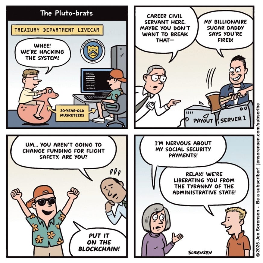 Musk’s latest attempts at accessing the personal data of three hundred and fifty million Americans are precisely for controlling their lives by leveraging their histories against them. Our choices in working for leaders we don’t like are becoming increasingly restricted to either that or homelessness and destitution. That’s not much of a choice.