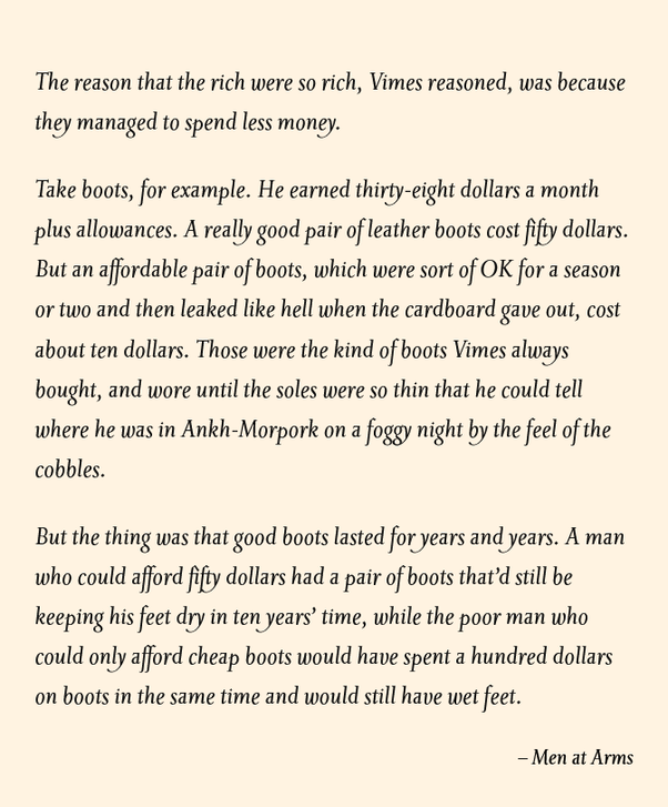 The most straightforward rendition of this view of economics is given by Terry Pratchett in his 1993 Discworld novel Men at Arms, through a character named Captain Samuel Vimes in a “Boots Theory of Economics”