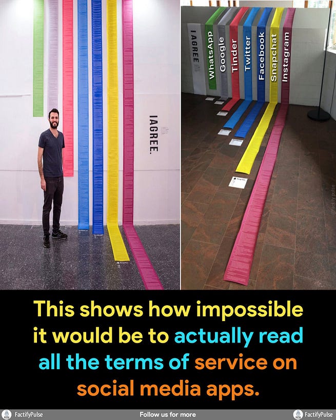 Here’s an example art installation piece by Dima Yarovinsky entitled “I Agree,” which shows how entirely exploitative a contractual agreement can potentially be for creatives who rely on social media to gain exposure to their work.