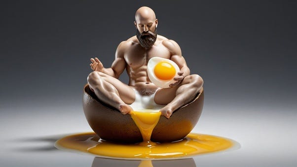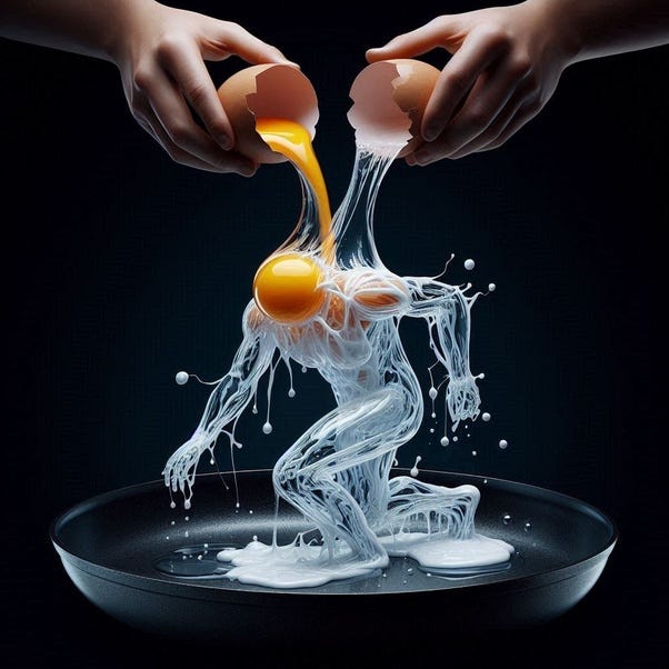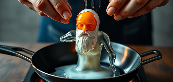 “A hyper-realistic, ultra-detailed image depicting a surreal scene where two hands are cracking an egg shaped like a human head over a frying pan. The egg yolk and egg white pours into a human form in the shape of a bearded God. The yolk forms God’s head, while the egg whites appear as crystal-clear water, gracefully shaping the body’s arms, legs, and fluid contours. The frying pan is set over a realistic flame, with the light from the fire casting warm reflections on the watery figure and the pan. The background is slightly blurred to focus on the intricate details of the egg yolk, the clear water-like egg whites, and the textures of the cracked egg shells, hands, and pan. The scene combines surrealism with high realism, capturing the transparency and fluidity of the water-like egg whites in stunning detail.”